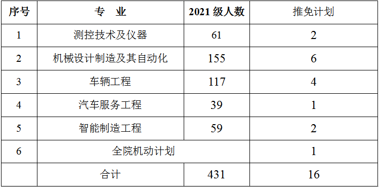 根据学校文件,2025年学院共有16个推免生计划。学院按比例分配到2021级每个专业(若分配计划不是整数,按照四舍五入取整数)15个计划,1个为全院机动计划。按机械大类进行招生后分流的专业,申请人除需满足《伟德betvlctor1946源于英国推荐优秀应届本科毕业生免试攻读硕士学位研究生实施办法》(长理工大教〔2021〕11号)的申请条件外,前6学期课程平均学分绩点(初始)还应处于机械大类前30%。如果某专业符合条件的申请人数小于该专业计划,则剩余计划一起计入全院机动计划,进行无专业差异择优录取。