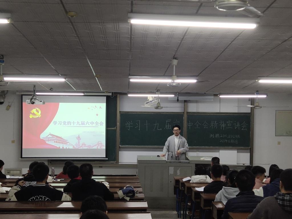 “党的十九届六中全会是在重要历史关头召开的一次具有重大历史意义的会议。全会审议通过的《决议》深刻揭示了过去我们为什么能够成功、未来我们怎样才能继续成功。”测控2102班宣讲人郑佳欣满怀热情地向新生介绍。