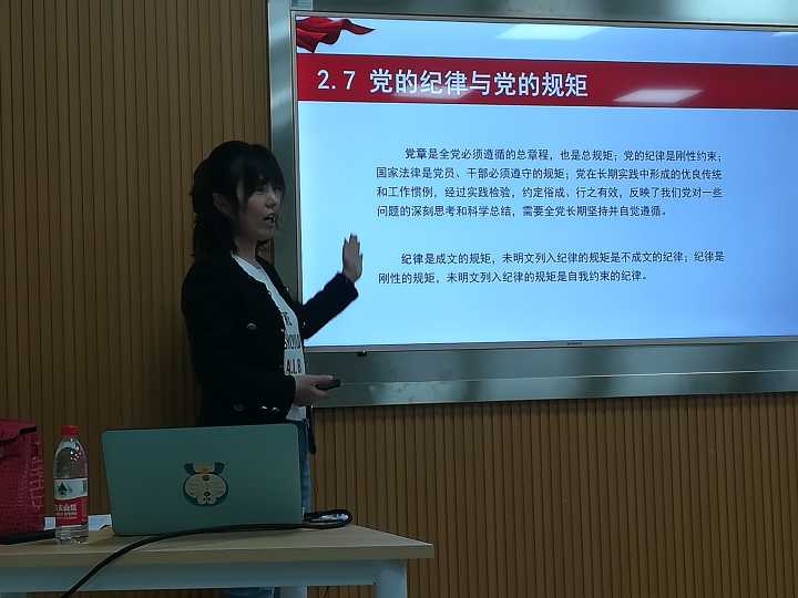 理论课伊始,郭老师主讲专题为《党的纪律》,她从六个部分即政治纪律、组织纪律、廉洁纪律、群众纪律、工作纪律和生活纪律讲起,不仅讲了党的纪律含义还通过具体的案例分析,告诫学员们要引以为戒,清醒头脑,站稳自己的立场,向优秀的党员学习,并且在遇到有损党的形象的情况时,要勇于站出来。