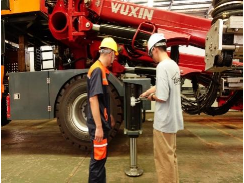 会后实践团成员与崔经理前往五新隧装产业园进行实地调研,在调研过程中实践团成员发现该公司的混凝土湿喷机的液压支腿和路基路面动态弯沉与回弹模量联合测试设备的顶升装置在原理和结构上都极为相似。因此实践团成员就目前设备顶升装置的液压系统在使用过程中存在的漏油以及难以保证四个顶升油缸同步性等问题与制造部的刘宣展开交流,刘宣认为:“实践团应从顶升装置的结构入手,从根本上解决液压系统漏油问题,同时可以在液压回路中安装调速阀,通过改变调速阀的阀口液压油进出量大小,保证四个顶升油缸的同步性。”实践团成员认真听取了意见,并及时做好了笔记。