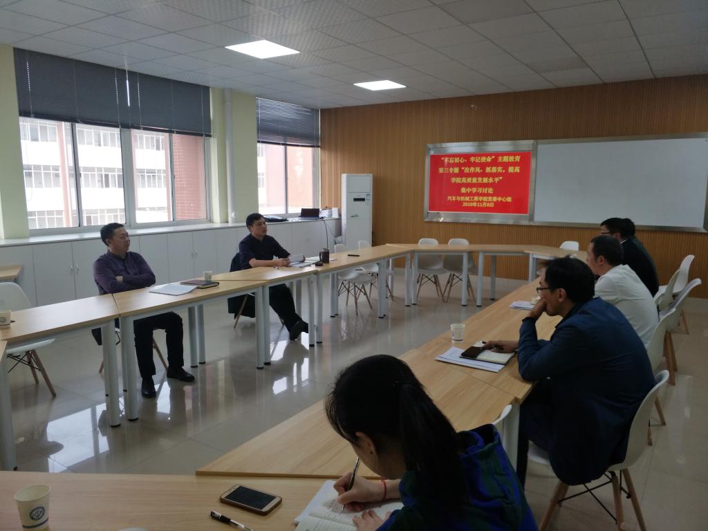 11月8日下午,汽机学院集中学习讨论了“不忘初心、牢记使命”主题教育第三专题“改作风、抓落实 提高学院高质量发展水平”。学院全体党政领导班子成员参加了本次学习讨论。由学院党委书记邱国良主持会议。