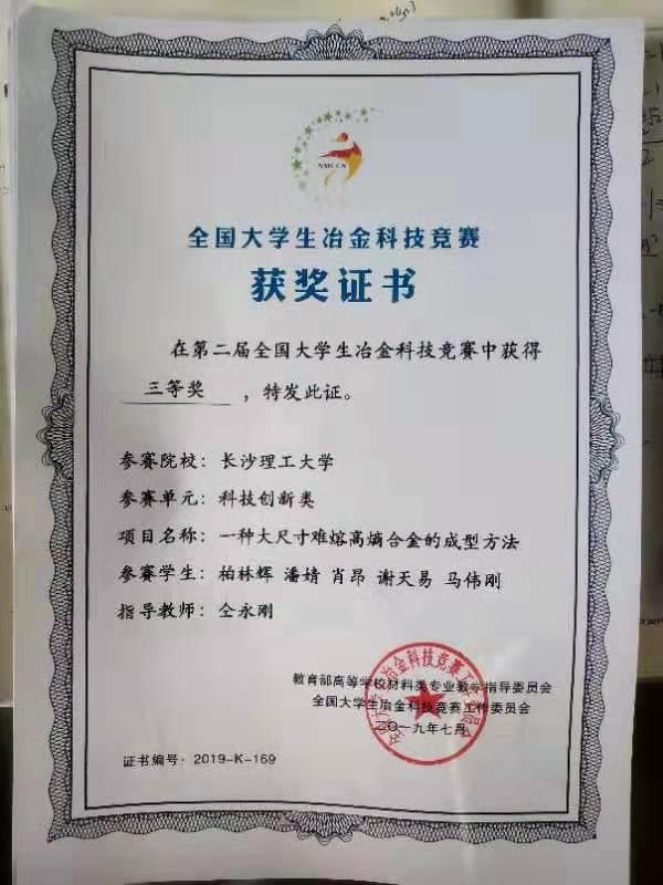 伟德先进制造工艺与高性能材料研究团队仝永刚老师指导,汽车与机械工程学院张浩、唐丽霞、陈贤胜、刘吉明、贾小勇、柏林辉、潘婧、肖昂、谢天易、马伟刚等10位学子组成两支参赛队伍,提交的作品:“一种热轧带钢卷筒再制造材料的设计与制备技术”与“一种大尺寸难熔高熵合金的成型方法”分别荣获了科技创新类竞赛全国二等奖和三等奖。(文/彭琼英 图/华熳煜 审/华熳煜)