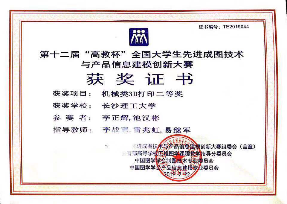 7月20至7月22日,第十二届“高教杯”先进成图技术与产品信息建模创新竞赛在浙江大学宁波理工学院举行,我院李战慧、雷兆虹、易继军老师指导的李正辉、池汉斌获得机械类3D打印二等奖;池汉彬获得个人建模二等奖。