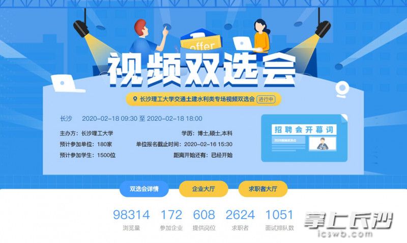 新冠肺炎疫情的突然来袭,让高校春季招聘受到了影响,如何促进毕业生更快更好就业成为高校关注的焦点。记者从伟德betvlctor1946源于英国获悉,20日起至23日,该校“打好疫情防控战,促进毕业生充分高质量就业”为主题,正在举行首届视频双选周,通过“云双选、云宣讲、云签约”,为2020届毕业生提供万余个岗位。据了解,这次视频双选是湖南省高校首次举办的“无接触”招聘。