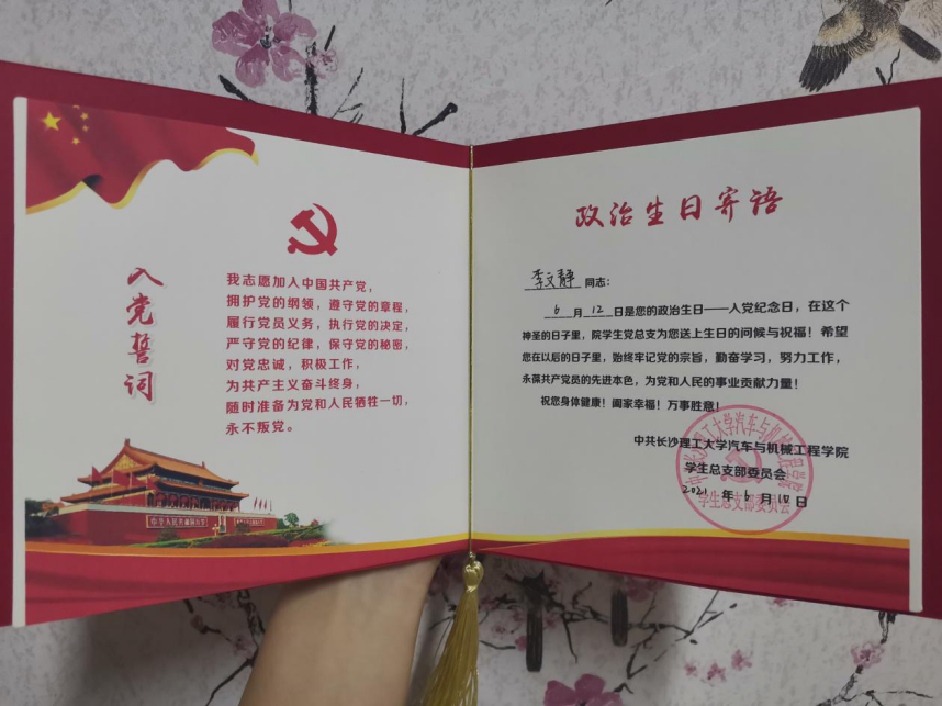 一名毕业生党员表示:“即将毕业离开母校,在依依不舍中收到了人生中第一份‘政治生日’礼物,倍感意外和开心,觉得特别有纪念意义。毕业后,会继续牢记党的宗旨和使命,为党和人民的事业贡献力量。”