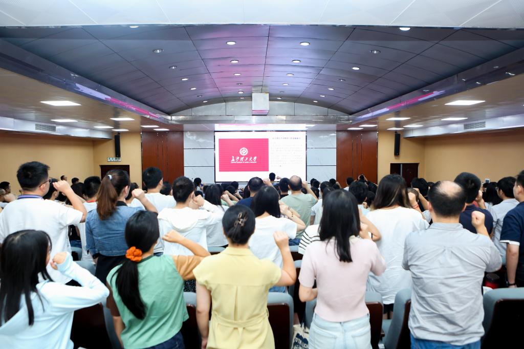 在人事处师资队伍建设科科长、岗前培训班班主任董端的带领下,全体新进教师面向校旗,高举右拳,举行了庄严的入职宣誓仪式。