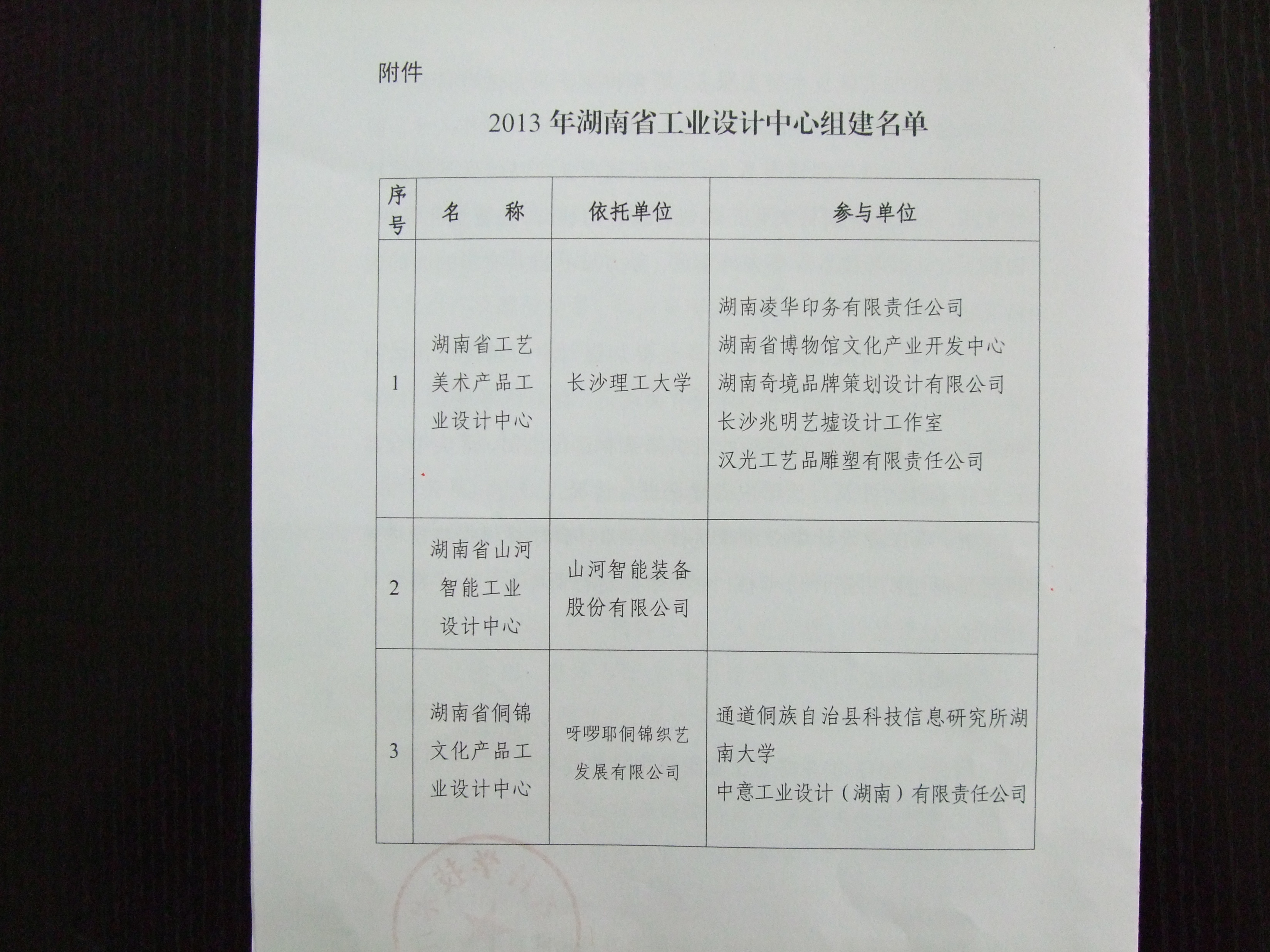 2013年10月21日,湖南省科技厅正式下文批复了我院申报的湖南省工艺美术产品工业设计中心。