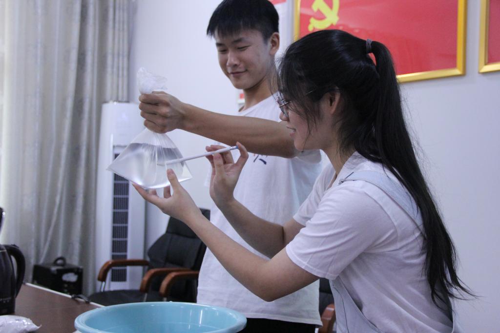 图为实践团队员为孩子们演示“扎不破的水袋”实验。邹建云 摄