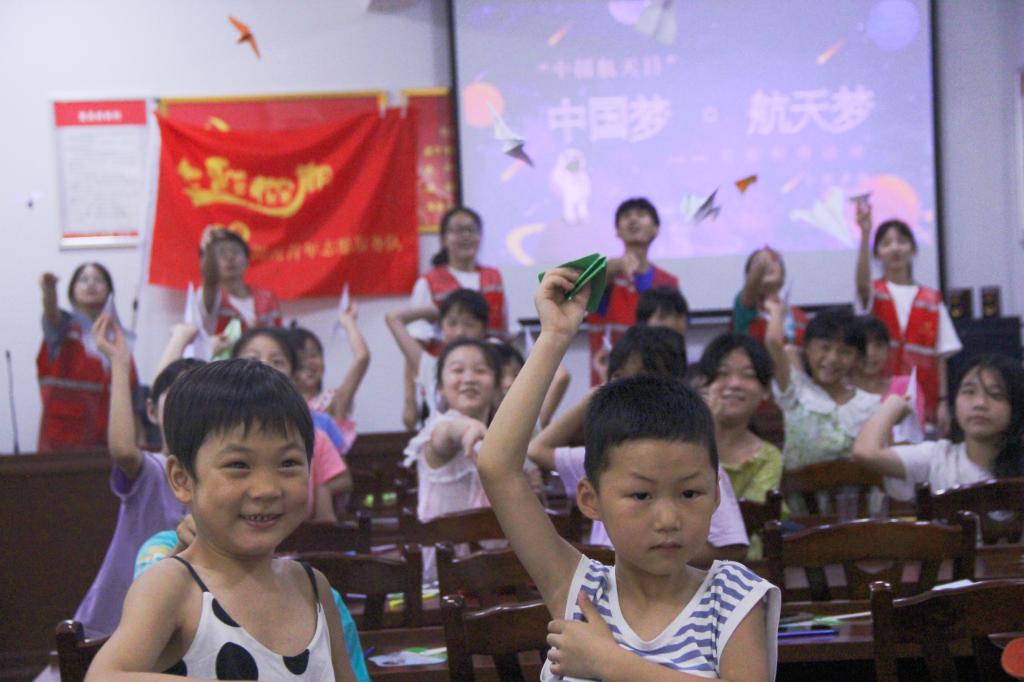 图为孩子们在“中国航空航天”科普课结束后放纸飞机。邹建云 摄