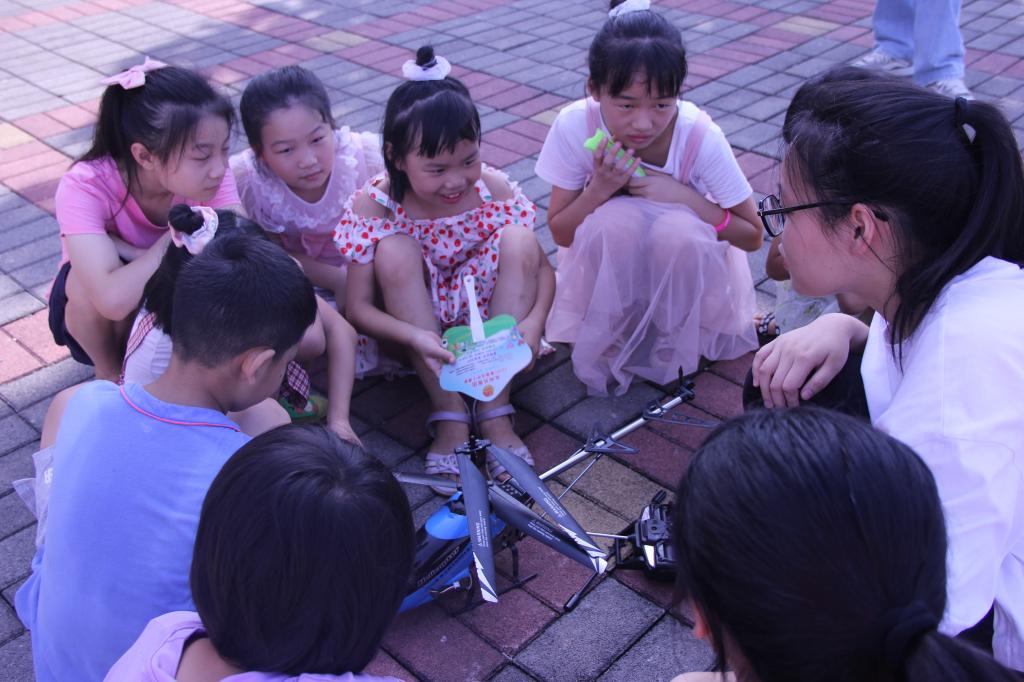 图为实践团队员为孩子们讲解直升机构造。邹建云 摄