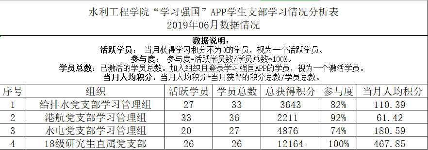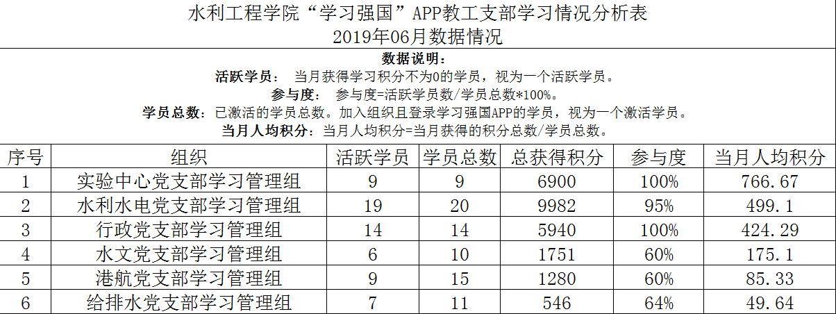 6月份我院教工党员、学生党员及学生团员在“学习强国”平台上的学习情况良好,整体活跃度较高,通过比对6月1日及7月1日,每个支部和党员的学习分数,得出了6月份我院党员的学习情况,现通报如下: