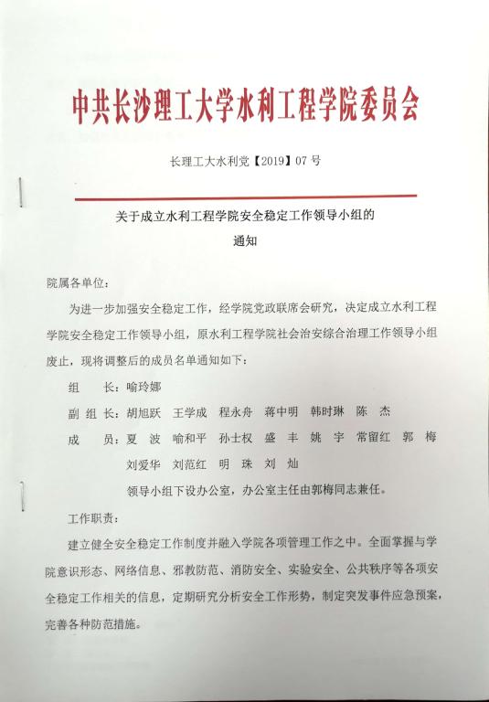 关于成立水利工程学院安全稳定工作领导小组的通知(长理工大水利党【2019】07号)