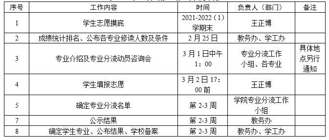 全体学生动员——发放摸底表——填报摸底表——专业分流动员咨询会——成绩统计排名公示——公布各专业修读数及条件——学生填报志愿——确定学生专业——公布结果——学校备案