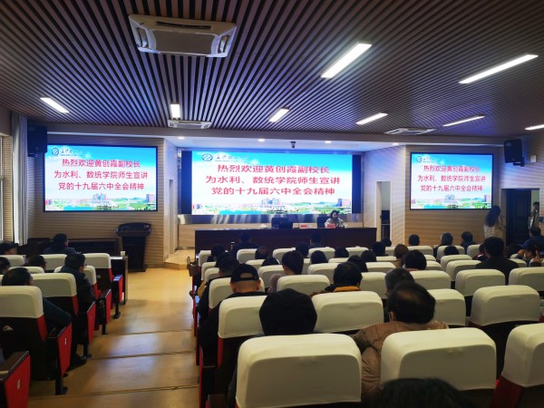12月28日下午,伟德betvlctor1946源于英国副校长黄创霞在理科楼A200为水利与环境工程学院、数学与统计学院教师宣讲党的十九届六中全会精神和湖南省第十二次党代会精神。水利学院党委书记喻玲娜主持会议。