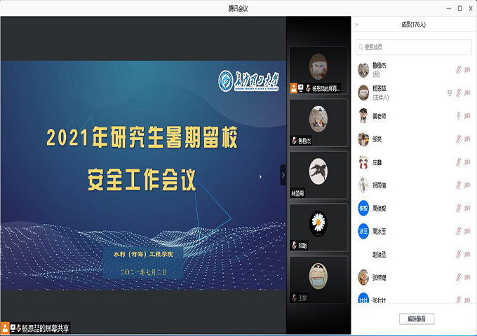 为做好暑期期间留校研究生安全管理工作,水利工程学院于7月2号上午召开研究生暑期留校安全线上会议。研究生辅导员綦丽及全体留校研究生参加了此次会议,会议由綦丽主持。