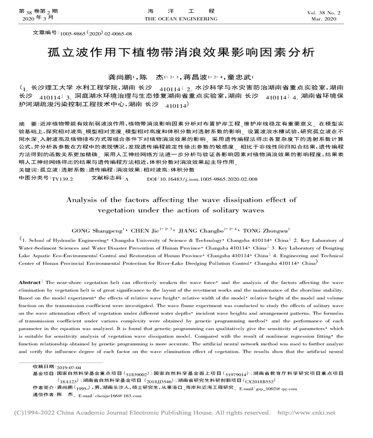 近日,CSCD核心期刊《海洋工程》公布了2020年度优秀论文评选结果,其中我院2017级硕士研究生龚尚鹏为第一作者发表的学术论文“孤立波作用下植物带消浪效果影响因素分析”成功入选。