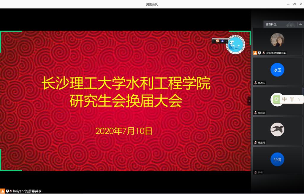 7月10日晚上,水利工程学院2020年研究生会换届大会通过腾讯会议平台线上召开,辅导员肖苹宁老师、校研会干部代表、18级院研会干部以及参与竞选的19级同学参加了此次会议,会议由水利1901班班长王茜雅同学主持。