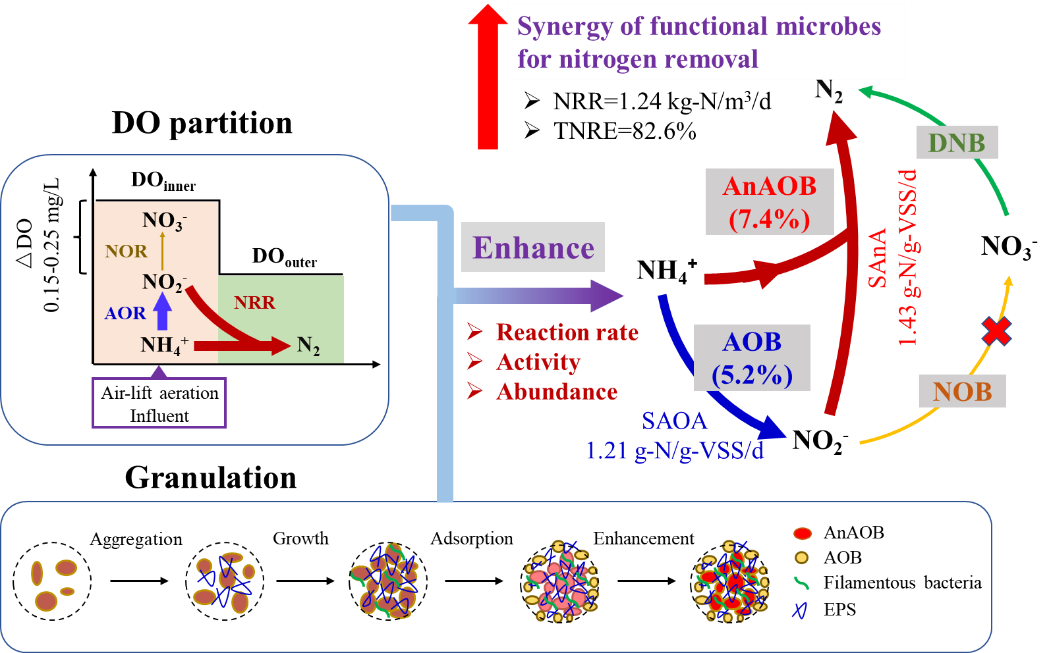 该论文针对一段式自养脱氮工艺在实际应用中启动慢和稳定性差的问题,自主设计研发了内外分层、溶解氧分区的气升式内循环生物反应器,并开展了长达360天的连续性实验研究。文章考察并验证了自制反应器的溶解氧分区效果,监测了长期运行过程中自养脱氮性能的变化,进一步分析了工艺稳定性影响因子及控制水平。通过对污泥形态结构、组分含量和微生物多样性及群落结构演替的解析,揭示了自养脱氮颗粒污泥体系内功能微生物的协同脱氮机制。该研究结果为一段式自养脱氮工艺的工程化应用提供理论指导和技术支持。本研究得到了湖南省科技厅(2022SK2091, 2020JJ4602, 2020JJ4617)和湖南省教育厅(20A002)科研项目的资助。
