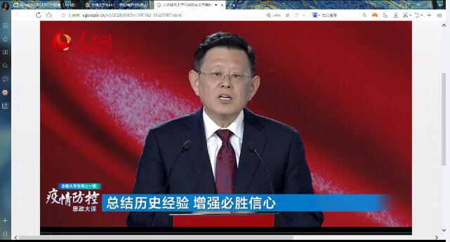 3月9日下午,由教育部社科司与人民网联合组织的“全国大学生同上一堂疫情防控思政大课”在人民网、咪咕视频客户端播出。我院师生通过观看直播等方式同上了这堂生动的“思政大课”,辅导员、班主任和班导师们引导各班级同学开展了在线学习讨论。