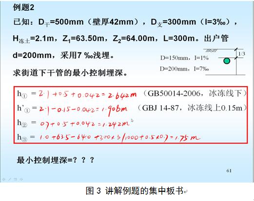 最小控制埋深的例题,教材上没有,布置完后给学生10min当堂试做一下,再在腾讯讨论区反馈下计算的结果。结合学生的计算结果,利用数位笔书写解题过程(图中红色手写文字部分),书写的过程中是有语音的讲解的,这样学生更容易理解和掌握。