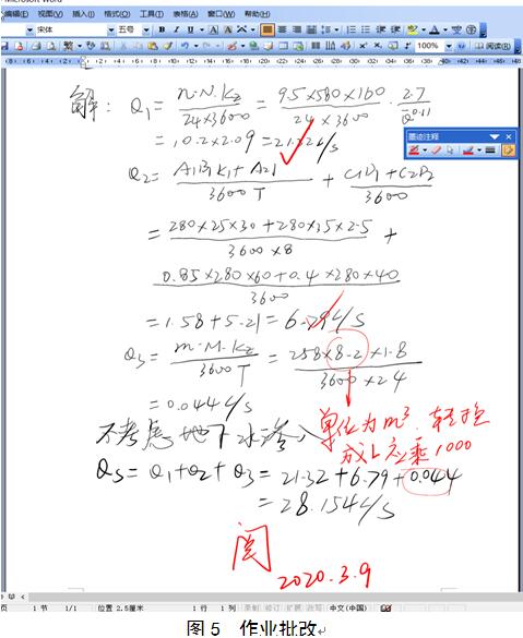 线上教学另外的一个困难就是作业的批改。电子版的作业若没有好用的作业提交、批改平台,则批改困难。利用数位板批改作业如图5所示。学生可以利用数位板在word里利用“墨迹注释”手写完成作业。学生若没有数位板,可以手写完成纸质作业后拍照插入word完档里,也可直接完成word纯电子版的作业。学生把作业word文档发给老师,老师利用数位板+“墨迹注释”功能就可以手写批改学生的作业了,极大提高了老师作业批改的便捷度和工作效率。