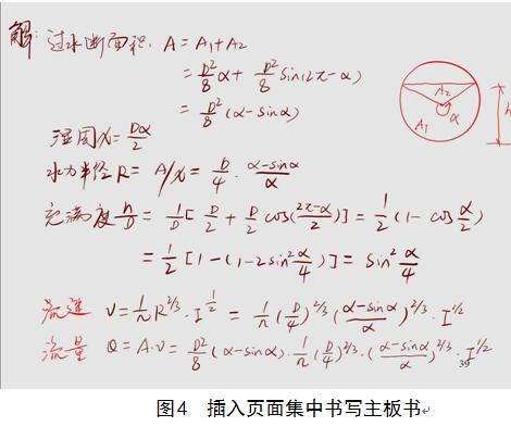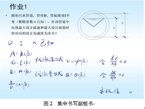 根据教学过程的需要,利用数位板的快捷键,可以随时插入新页面集中书写主板书,如图4。在ppt播放过程中,随时可以按一次默认的数位板快捷键“B键”,在当前播放页面插入一空白新页,在空白页中书写集中板书,比如公式推导、插图绘制等。图5中是非满流污水管水力计算公式的推导板书。在板书的过程中有同步语音解释,这样学生掌握起来更容易。推导讲解完后,再按一次数位板的“B键”,回到ppt播放界面。这种随时插入新页面书写板书的优势是根据需要,随时插入,切换方便。比如在讲授影响排水管道的平面布置因素这一小节中的“地形相关的四条布管原则”,讲到“当地面坡度较小,干管与等高线垂直,主干管与等高线平行”、“当地面坡度大,干管与等高线平行,主干管与等高线垂直”这两条原则,当解释完后,就有学生在讨论区发言——老师能不能画个图讲解下,没太理解。那么这时就可以利用数位板“B键”插入新页绘制插图,再结合图讲解一下,讲解完后再切换回播放页继续讲课,比较方便快捷。