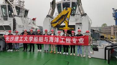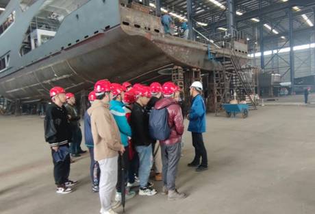 4月13日下午,师生一行人抵达常德市达门船舶有限公司,该公司生产的港口工程船舶是国际船舶高端产品市场的热销产品。同学们在船厂负责人的带领下,深入生产车间与全回轮双混动力拖轮内部进行参观,对船厂规范化管理和标准化、模块化的造船方式也有了进一步的了解和学习。