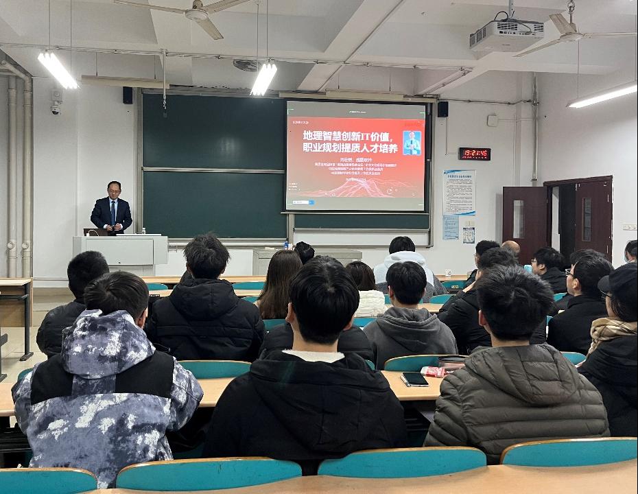2023年2月23日19:00,工科三号楼B218教室,全球第三、亚洲最大的地理信息系统(GIS)软件上市企业超图软件集团首席品牌官刘宏恺先生为水利与环境工程学院地理信息科学专业学生做了题为“地理智慧创新IT价值,职业规划提质人才培养”的精彩报告。讲座由副院长孙士权教授主持,湖南省自然资源事务中心督查事务部副部长朱家彪高级工程师,超图集团华中平台客户中心总经理邝野,地理信息科学专业武海鹏副教授及相关老师出席了讲座。