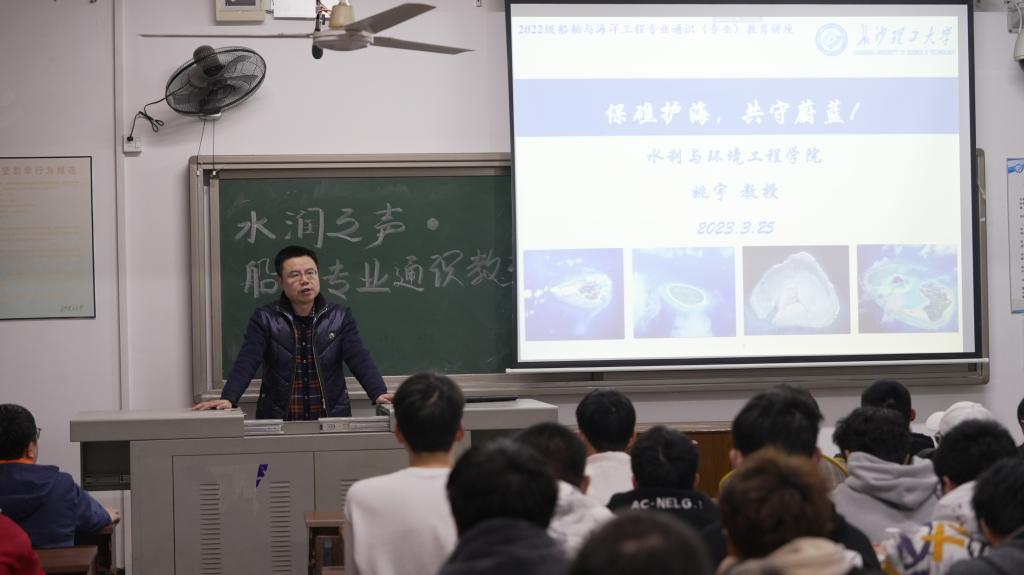 2023年3月25日晚,水利与环境工程学院姚宇教授在金12-307教室为伟德学生开展以“保礁护海,共守蔚蓝”为主题的通识教育以及专业认知教育讲座。本次讲座由陈龙老师主持,船海专业全体教师出席了活动,七十多名学生聆听了讲座,并与老师进行了互动交流。