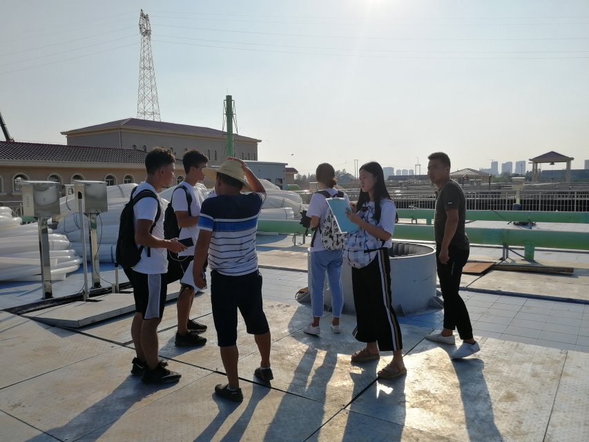 华容桥东污水处理厂负责人庞站长带领团队成员参观污水处理厂的结构并对工艺流程进行了详细的解说。桥东污水处理厂分为污水一级处理系统,二级处理系统,污泥脱水系统以及污水深度处理系统。该污水处理厂主要通过物理沉淀和生化反应沉淀处理污水,物理沉淀主要利用自然、电流以及压差处理块状较大的污泥,而生化沉淀主要利用微生物或化学药剂来处理污水中较细的污泥。
