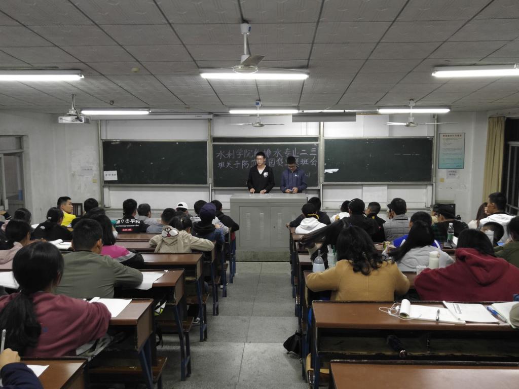 针对近期社会及高校普遍出现的“校园贷 培训贷”问题,为进一步提升学生安全意识和安全防范能力,10月21日晚,水利工程学院18级新生在金盆岭校区12教召开防范“校园贷 安全贷”主题班会,会议由各班安全委员主持。