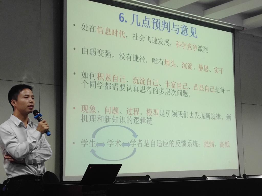讲座开始,李志威老师就课题“弯曲河流颈口裁弯过程与机制”进行了讲解。从科学提出问题到野外测量、水槽实验,再到理论建模和数值分析,李老师详细的讲解了整个研究过程。之后,李老师就研究生如何做科研进行了探讨。他指出,研究生阶段除了课程学习,还要进行同步文献研读,建立知识体系。找准研究生阶段的定位,培养较强的科学素养,不被功利所诱惑。讲座最后,李老师提出了一些意见。他说,做科研是一个由弱变强的过程,没有捷径,唯有埋头、沉淀、静思、沉淀,如何积累自己、沉淀自己、丰富自己、凸显自己是每一个同学都需要认真思考的问题。