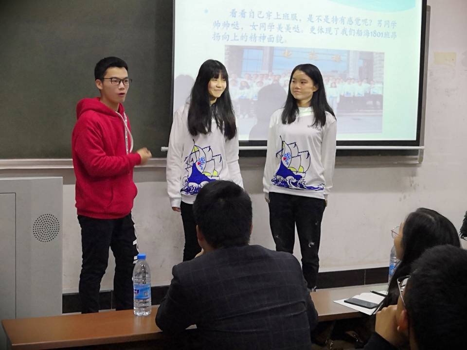 本次比赛分为班服展示与班服介绍两个环节。班级代表结合现场展示为评委与观众介绍了班服设计过程、主要组成元素以及班级展示照片等内容,他们或以古诗为设计背景,或以白鹤为设计亮点,或将水,河,海等元素融入班服设计中,简约而富有深意,展现了班级智慧碰撞的火花与班级建设发展的憧憬。3位评委根据展示效果与讲解进行打分。黄远发肯定了本次活动在加强班级凝聚力中的作用,杜丘则围绕展示方式设计与ppt制作等方面提出了意见。经过评委打分与线上投票,给排水1803班获得了本次班服大赛的一等奖。