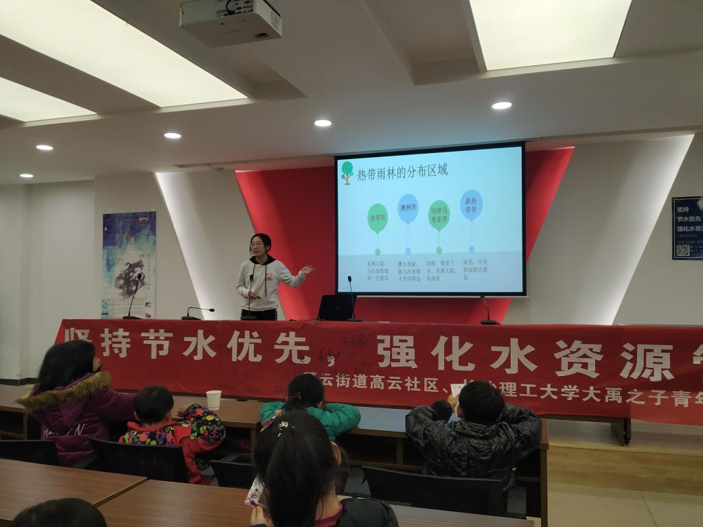 “我们用的水主要来自于地表水和地下水,降水、蒸发和径流决定了一个地区的水资源总量”,2019年3月,大禹之子青年志愿者协会的志愿者们走进社区围绕水资源保护与生态环境保护等内容为社区的小朋友们上了一堂生动的环保课堂。“你们知道水能发挥什么作用吗?”、“生活中我们需要水”、“农民伯伯灌溉需要水”、“水还可以养鱼”,在志愿者的引导下,参与的小朋友对于水的来源以及水在生产生活中的重要性有了深刻的认识。而通过地区干旱、水源污染、湿地破坏等视频的展示,小朋友们对地区水资源分配不均、生态系统相互影响、保护水源人人有责等进行了学习并在节水护水横幅上庄严的签上了自己的名字,表节水之心、示护水之行。