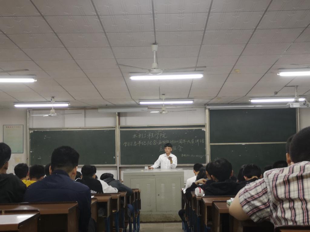5月4日晚,水利工程学院2018级学生在12教自习室开展学习习近平总书记纪念五四运动100周年讲话精神主题班会。年级辅导员黄远发参加班会并轮班指导学习。