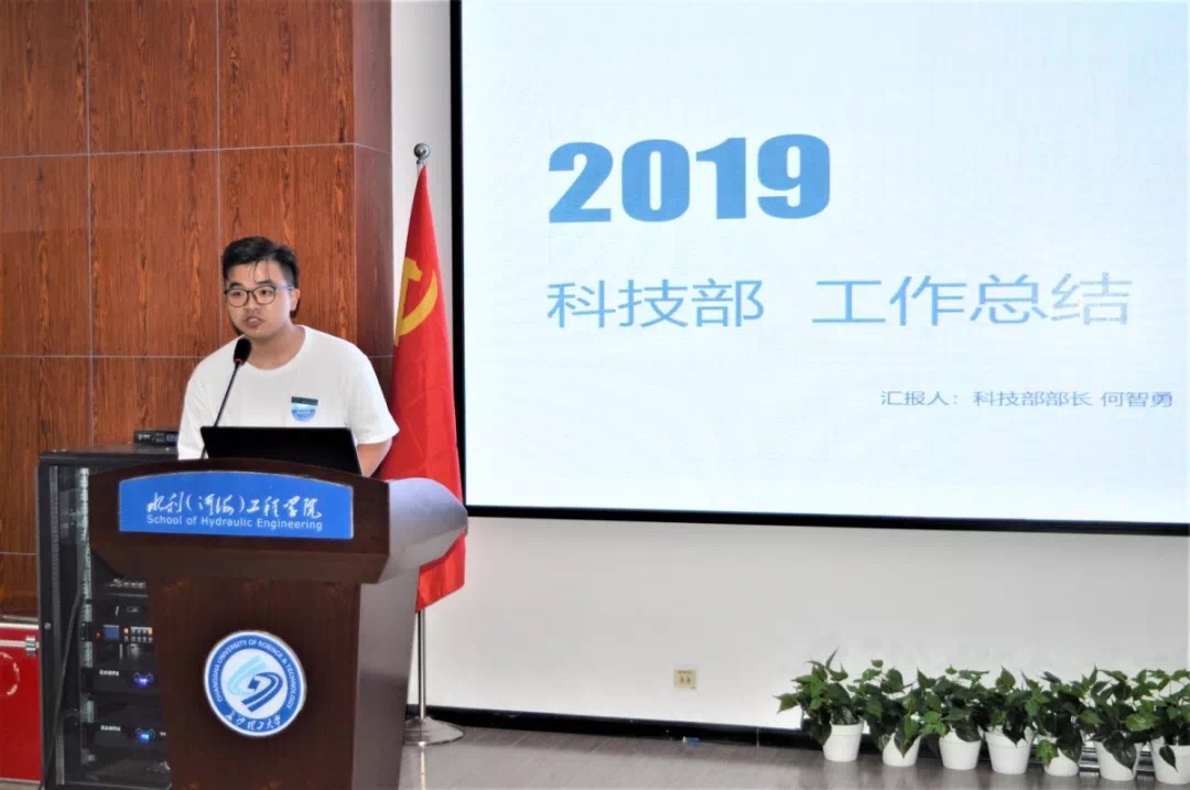 在齐唱国歌之后,团委学生会部门代表从工作内容、工作分工、工作成绩与工作不足等方面对本学年工作进行了汇报,客观公正的总结了部门在2018-2019学年的工作中的收获,展示部门的特色。