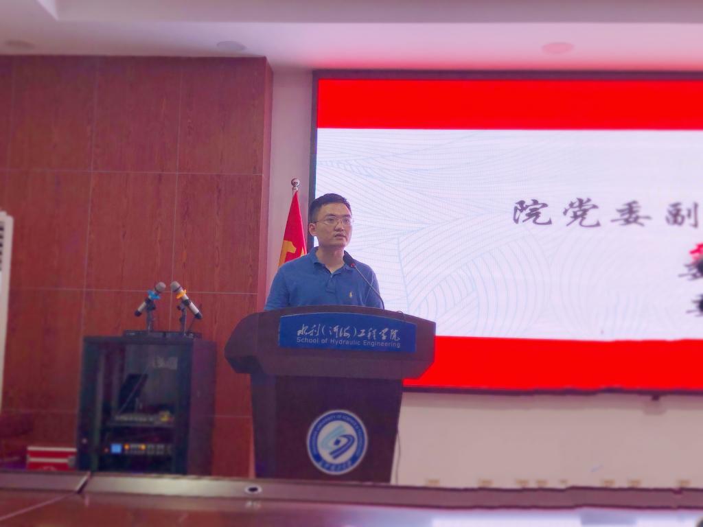 院团委书记杜丘宣读了《关于开展水利工程学院2019年暑期“三下乡”社会实践活动的通知》,就学院集中实践与分散实践相关要求与安排进行了详细的介绍。2018年全国“三下乡”社会实践优秀团队成员聂华林作为实践代表发言。他结合3年的社会实践经历分享了三下乡中的重点难点并代表全体三下乡成员表示在实践过程中将脚踏实地、严守纪律,用干劲、闯劲、钻劲投身社会实践中。在为14支校级立项的实践团队授旗后,王学成肯定了同学参与志愿服务的热情,寄语全体水利学子传承大禹人的优良传统,在专业老师的指导下志存高远,坚定信念,运用专业的科学文化知识服务当地群众,用实际行动担负保护江河之重任。