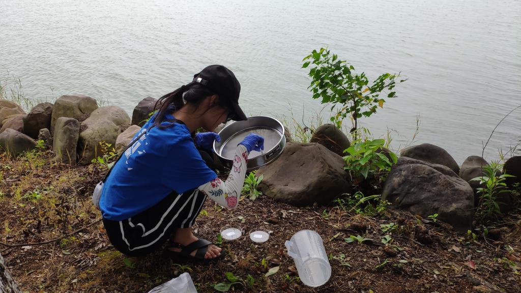 上午实践团前往洞庭湖千亩湖畔,结合湖畔地质条件以及取水条件制定了详细的取水计划。经现场调研,为保证游客安全,千亩湖畔的休闲长廊都修建了护栏,围护栏距离水面有约2米高的距离,给实践团采集水样增加了难度。为调研千亩湖中微塑料含量情况与湖边的地质条件,实践团成员经过走访在千亩湖畔相距约300米的两个取水点进行水样采集。在选点上,取水点地质条件良好,沿岸有稳固的石头,便于采取样本。在水质上,经过滤水样中杂质含量较少,类似于微塑料的细小颗粒含量较少,但是否为微塑料仍需进行进一步鉴定。
