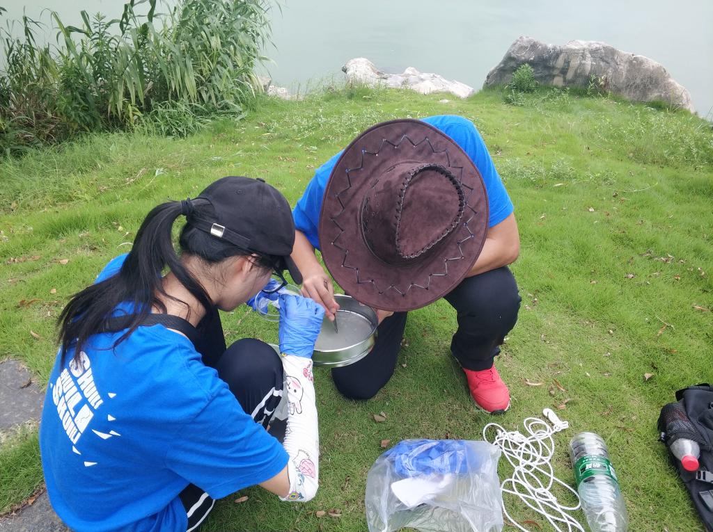团队结合前天实地考察情况围绕取水方式以及取水点进行了讨论,最终决定采取用尼龙绳绑住取水桶的方式取水。实践团分为两个小组前往初步选定的8个取水点。取水点每间隔五百米采集一份水样,在排污口采集一份水样。取水结束后现场用0.5mm孔径的标注筛过滤湖水并用镊子挑选出标准筛上的杂物。简单的水处理后实践团成员将杂物用培养皿装好,保鲜膜封口带回做返校进行后期处理。