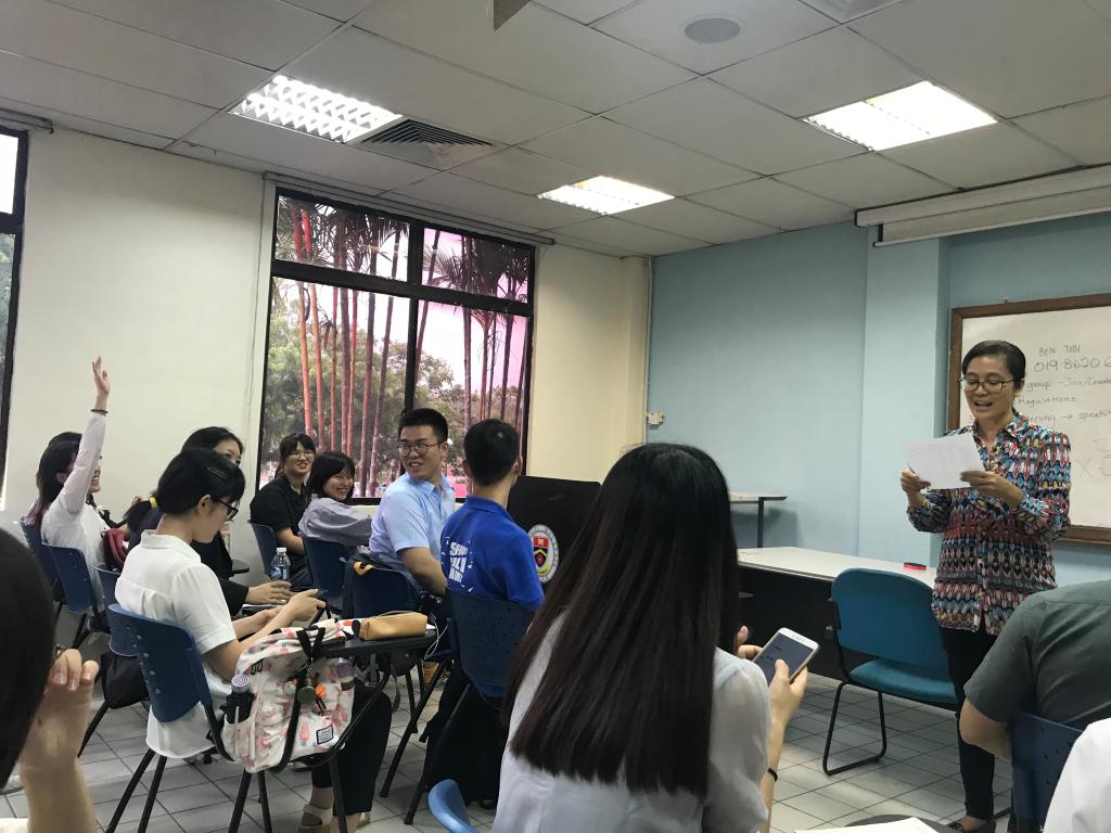 下午两点,实践团成员开始了在沙巴大学的第一堂课——语言课。在课堂上,Ms.BEN与同学们通过自我介绍的形式进行帮助成员以最快的速度相互认识。谈及如何学好英语,Ms.BEN从三个角度介绍了学习的方式与经验。首要在于Think in English.在学习英语过程中,抛掉习惯性的中文构思方式,尝试转用英语构思自己想表达的内容。其次在于加强口语练习。他希望同学们在沙巴大学期间使用英文进行日常的沟通与交流,不断提升自我的口语水平。在自信心树立上,Believe you can do it是Mr. Ben对于大家的鼓励。大家要发挥自己的优势,即使基础不佳的同学一定不要气馁,相信自己,勤加练习一定能够成功。同时,Ms.BEN 为实践团成员介绍了课程的课堂纪律和考核方式。
