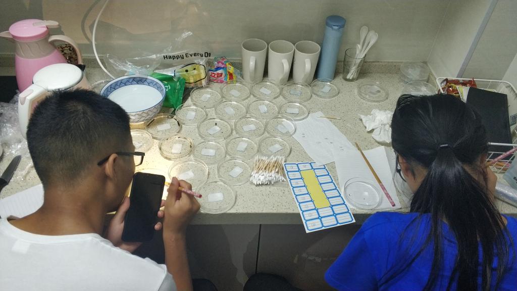 微塑料的初选是一个需要耐心和眼力的过程,小组成员在简易的工具——放大镜的帮助下,挑选出杂物。为提高准确性,团队成员依次初选各样本中微塑料,并标注每个样本中微塑料数量及特征,核对后用保鲜膜密封保存。