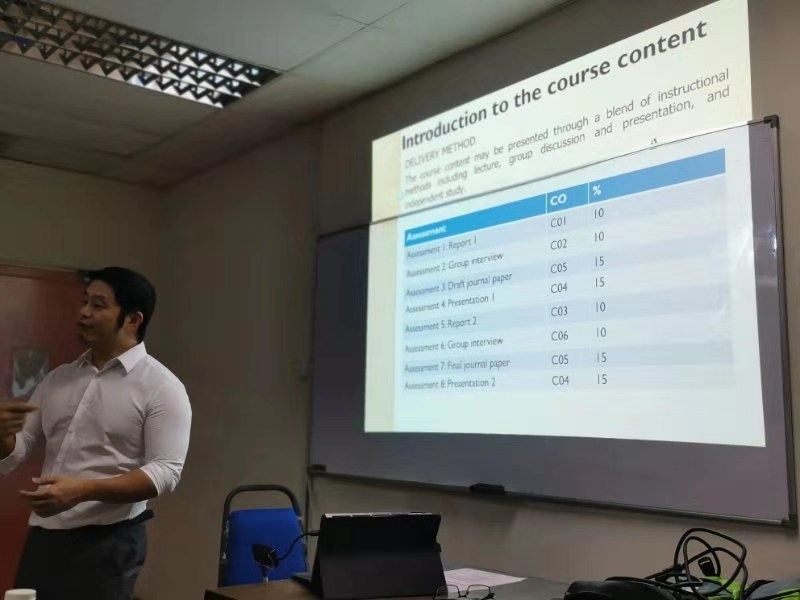 上午课程为 Research Design Project,由Mr.Andrew担任老师,Mr.Andrew指出考试只是检验结果的一种手段,他的课程不会只采用一种检验手段,而是采用多种形式考究学习成果。同时他就为什么做研究以及研究的意义和种类进行了讲解,让大家对于研究有了深入的了解与认识。授课过程中Mr.Andrew走近学生,耐心细致地解答同学们的疑问并布置了第一次汇报作业,第一次汇报将在第四周进行。