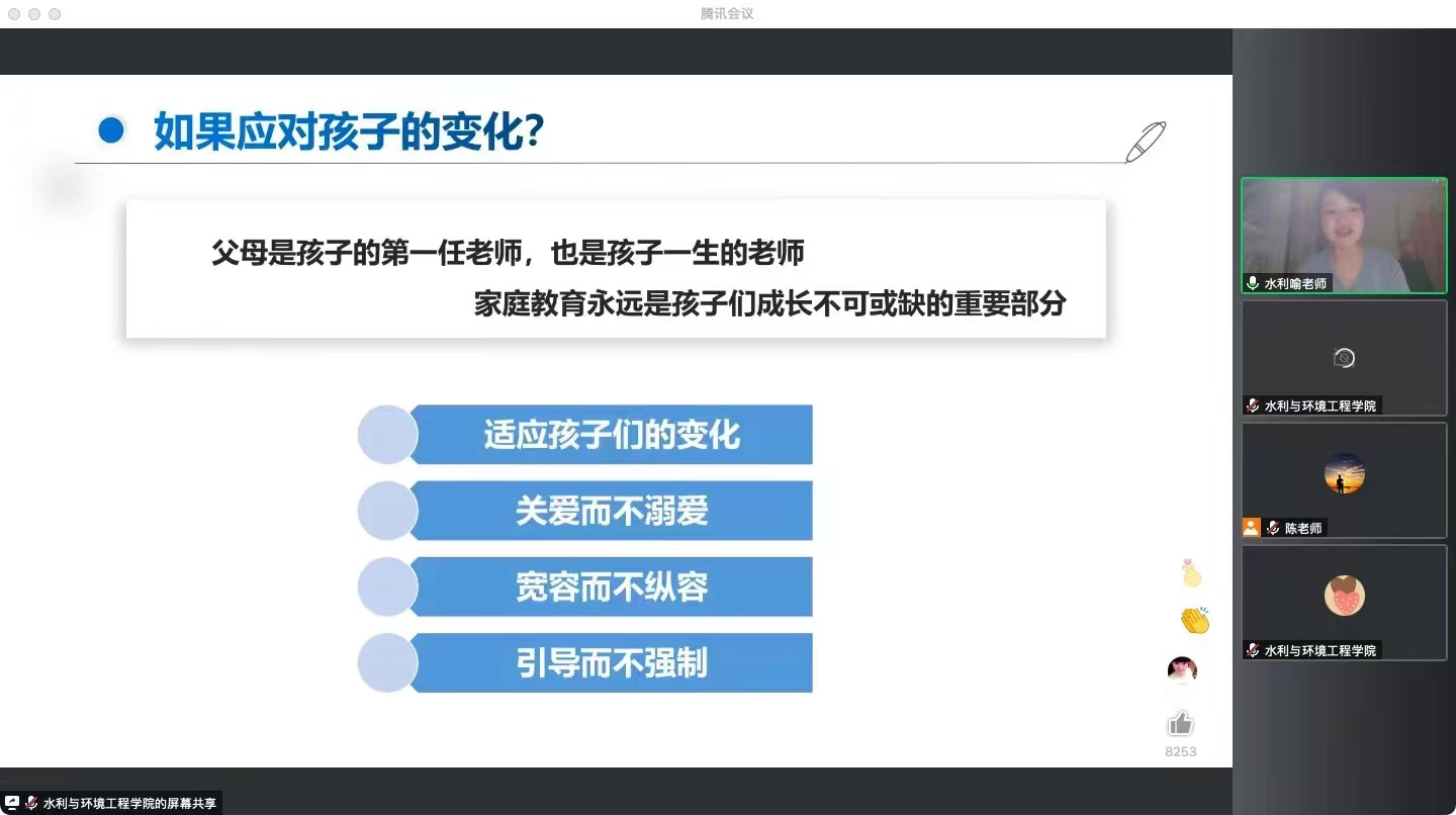 为深入推进家校协同育人,凝聚育人合力,8月25日晚19:00,水利与环境工程学院召开2022级本科新生线上家长会,院党委书记喻玲娜、院长陈杰、党委副书记银波、2022级辅导员刘灿、陈鑫林出席会议,来自全国各地的600余名新生家长参加,会议由银波主持。