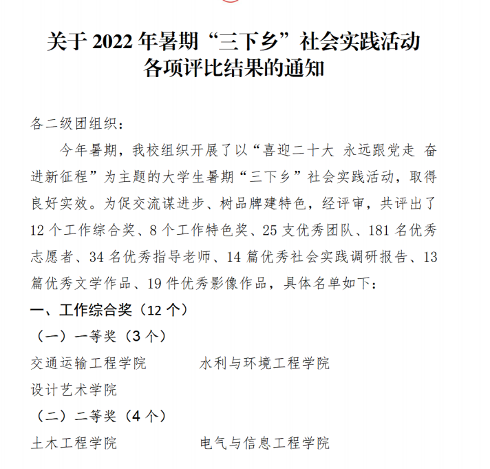 近日,2022年湖南省大中专学生志愿者暑期文化科技卫生“三下乡”社会实践活动总结结果和伟德betvlctor1946源于英国2022年暑期“三下乡”社会实践活动评比获奖名单公布,水利与环境工程学院在各项评比中喜获佳绩。