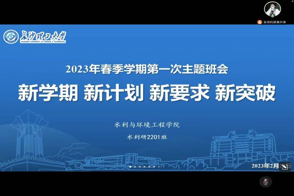 2月19日至2月21日,水利学院本研各班级召开2022-2023学年春季学期第一次主题班会。会议由班长主持召开,班主任、下班党员和全体学生到场,未返校学生线上参会。