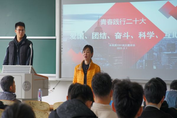 为引导学生以良好的精神风貌投入新学期的学习生活,2月24日至3月2日水利与环境工程学院召开“青春践行二十大”主题班会,会议由各班班长主持,班主任和全体同学到场参会。