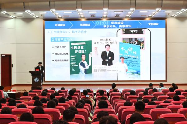 2022年“示范班集体”创建活动于2022年5月启动,经过班级申报、学院推荐和考核验收,确定20个班级为“示范班集体”候选班级。水卓2001班以先进性建设为主轴,制度建设为保障,寻浪的方向,逐梦的痕迹,形成“一轴两追一保障”的建设格局。班长宋宪林从班级建设、思想建设、学风建设和文化建设四个方面介绍班级建设举措和成效。