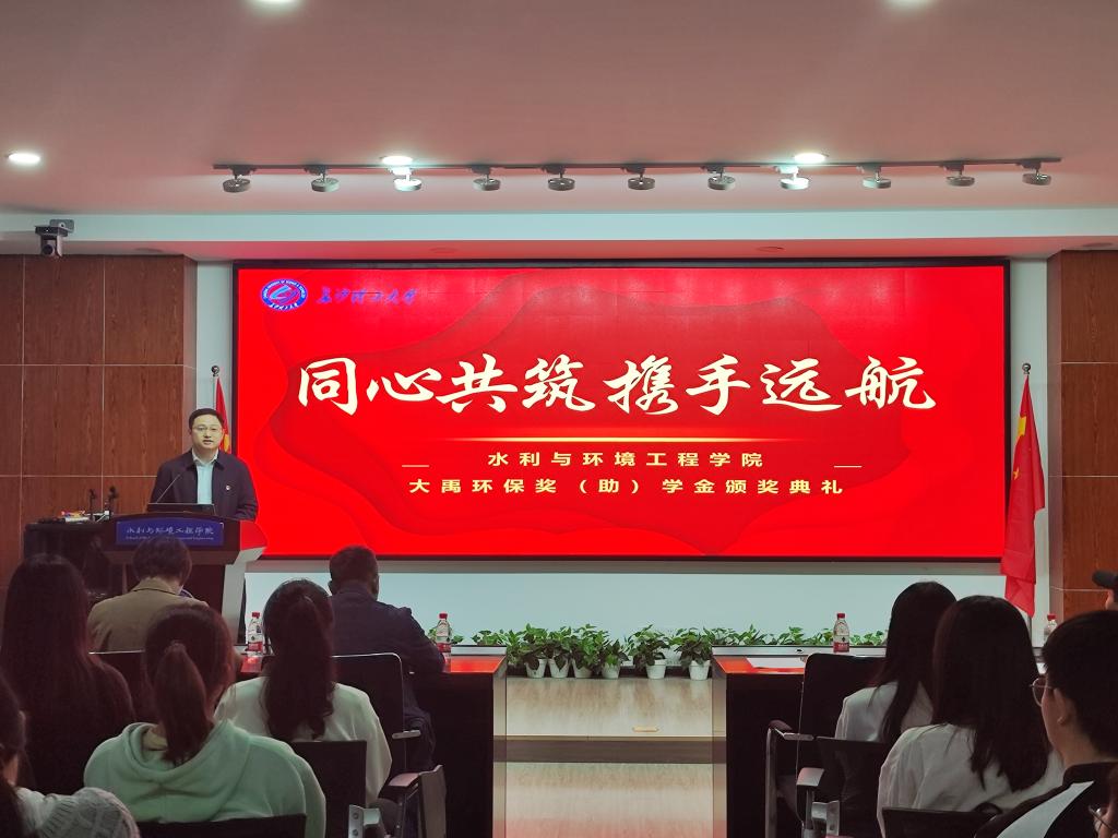 银波宣读了《关于表彰2022-2023学年水利与环境工程学院大禹环保奖(助)学金获得者的决定》,勉励全体环工专业学生以先进为榜样,奋发有为,再创佳绩。李奥祥作为获奖代表发言,他向一直以来关心环工学子的领导、老师们表示深深的感谢,他会将奖励转化为动力,继续努力在专业内深化“传帮带”作用,服务行业,回报母校。
