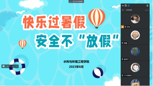 为做好暑假期间学生安全教育管理工作,8月1日至3日,水利学院本研各班级召开了“快乐过暑假,安全不放假”暑期安全教育主题班会,覆盖全体学生。