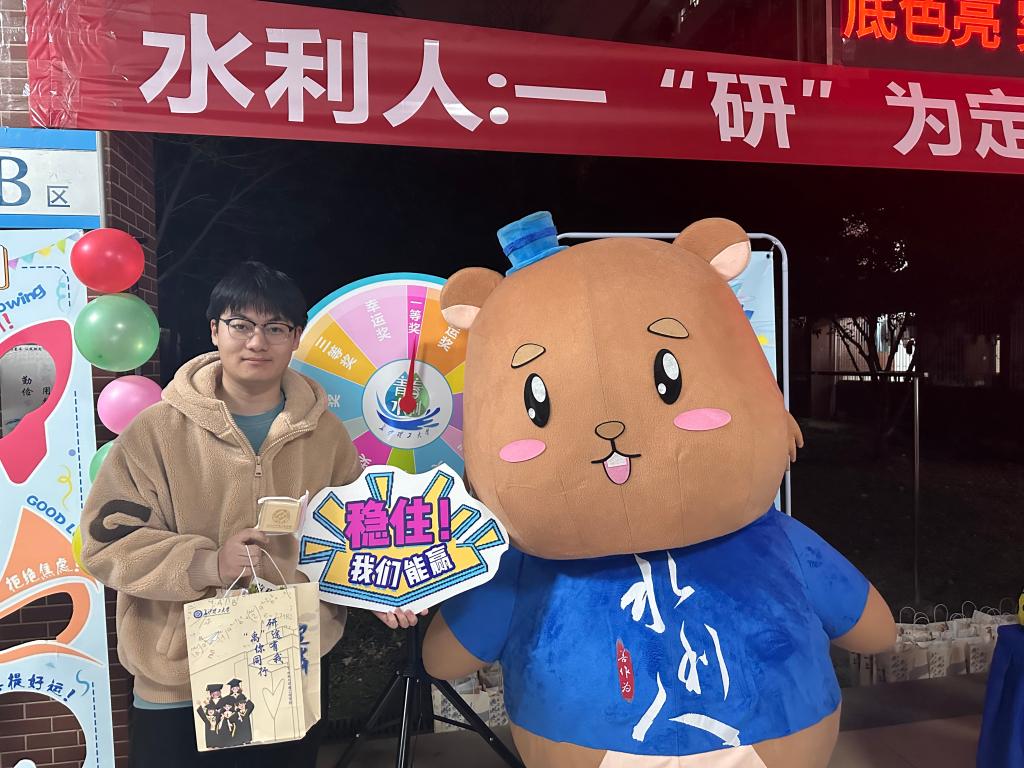活动现场还进行了幸运大转盘抽奖、好运沙包投掷、水狸玩偶“爱”的抱抱、研途顺利打卡等活动,帮助考研学子舒缓备考压力,激发考前动力,助力研考最后一公里。“乾坤未定,你我皆是黑马!”“分数+1,未来可期”,宿舍楼内考研学子的愿望语以及祝福语布满了留言墙,将一句句温暖的话语传递到每一位考研学子的心间。